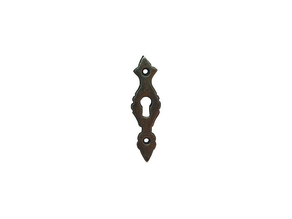 Jedná se o lité kování. Materiál mosaz. Základní povrchová úprava - mosazná patina. Klíčová dírka je vysoká cca 13mm. Spojovací materiál není součástí výrobku. Po okrajích štítku do dvou malých otvorů lze použít hřebíčky M7016 (malé otvory).