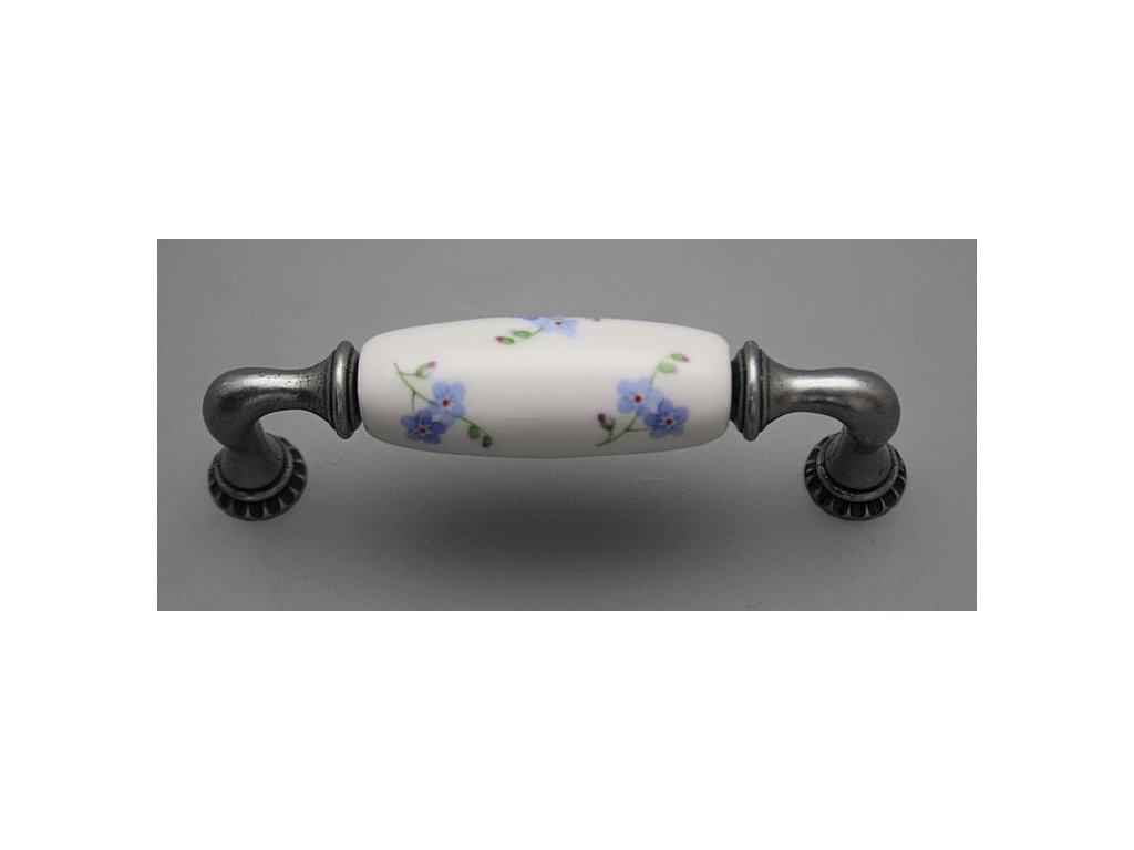 Luxusní mosazná úchytka s povrchovou úpravou STAROSTŘÍBRO, kombinovaná s porcelánem v bílé barvě s motivem pomněnek. Jedná se o velice kvalitní vypalovaný glazovaný porcelán s vysokou životností. Rozteč mezi šrouby je 128mm. Součástí dodávky jsou i dva šrouby s půlkulatou hlavou M4x20-45mm.