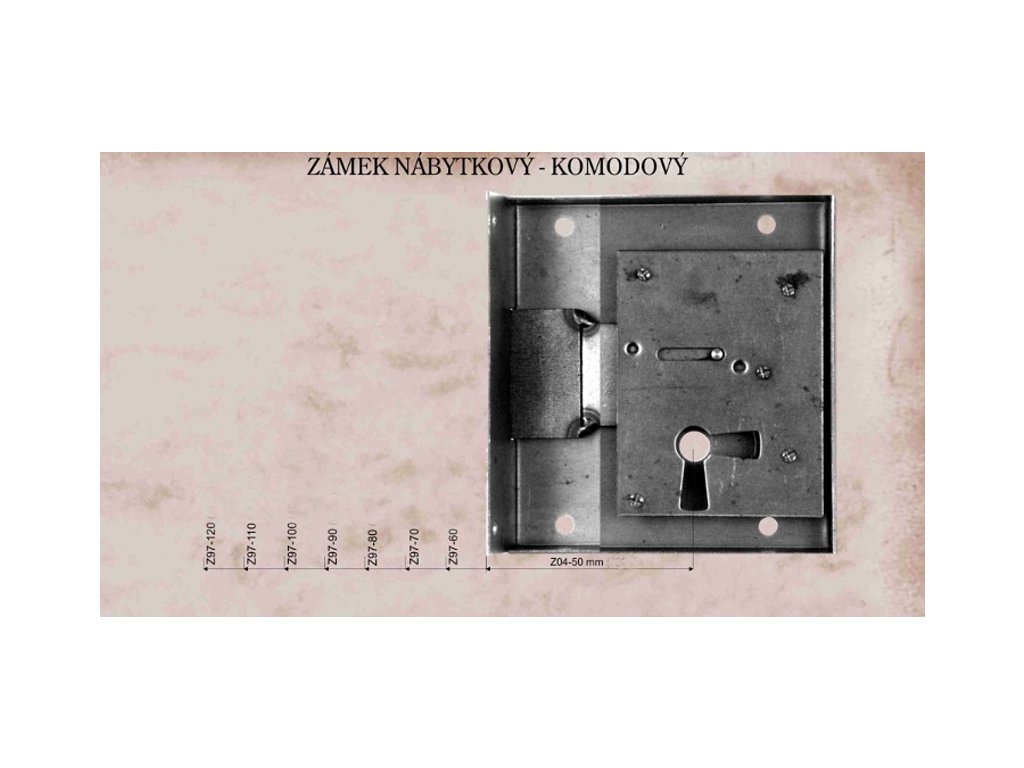 Mohutnější nábytkový komodový zámek, vhodný např. do skříní (na pravou stranu dvířek - při otevírání pravou rukou), komod i zásuvky, kde rozměr 50mm znamená vzdálenost od kraje zámku po střed klíčové dírky - viz. druhá fotografie. Rozměry krabičky: výška 90mm x šířka 85mm, použitý materiál je ocel, povrchová úprava ocel. Vhodný klíč: M1040 - viz. Související produkty. Klíč je nutné pořídit samostatně, není součástí zámku.